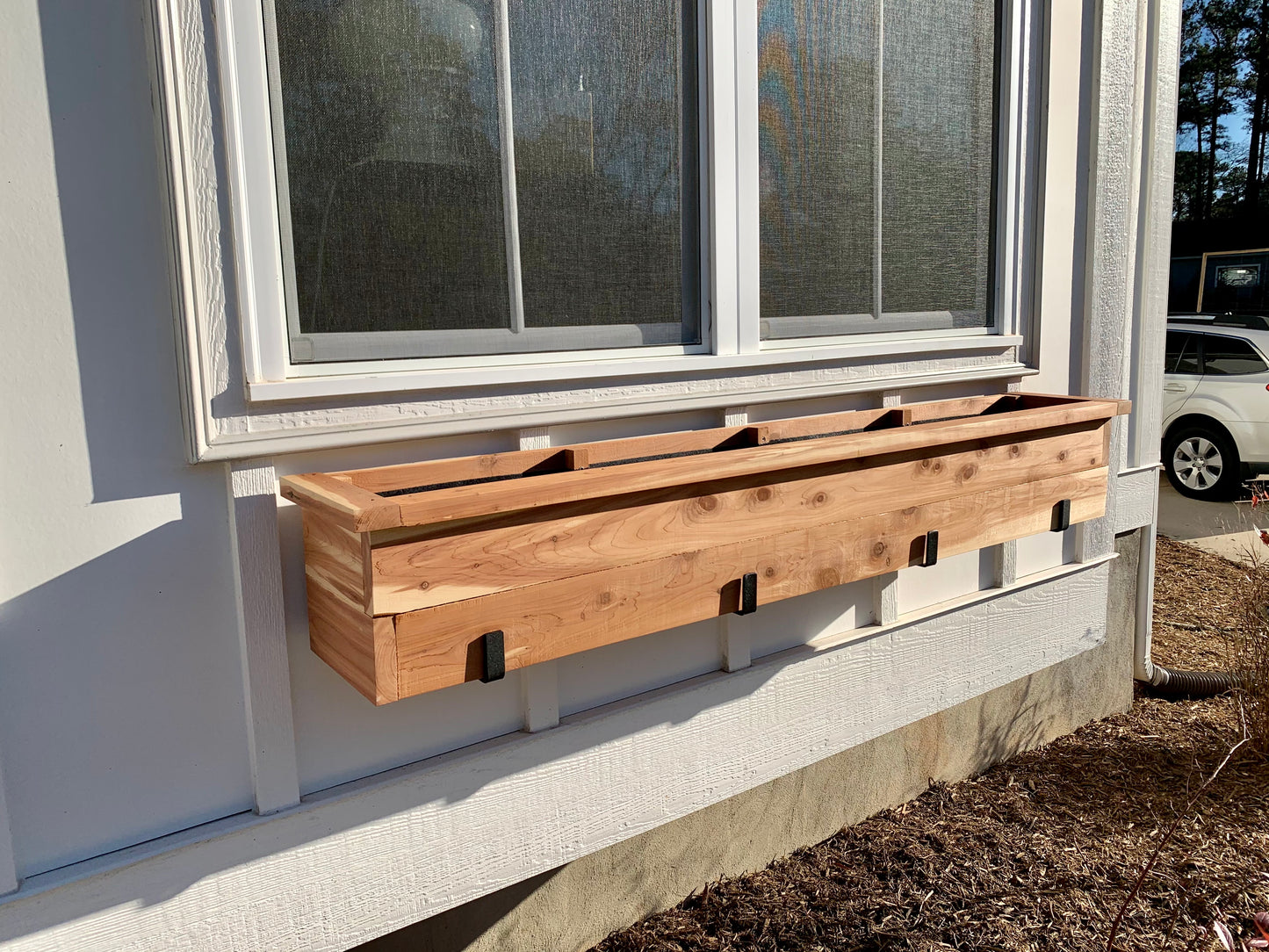 Using rough cut 1" x 4" cedar lumber, we make a sturdy window box, coated on the exterior to retain the cedar wood color and coated on the inside to eliminate the effects of water in the box. These window boxes come with two heavy duty steel 'J' brackets for mounting.