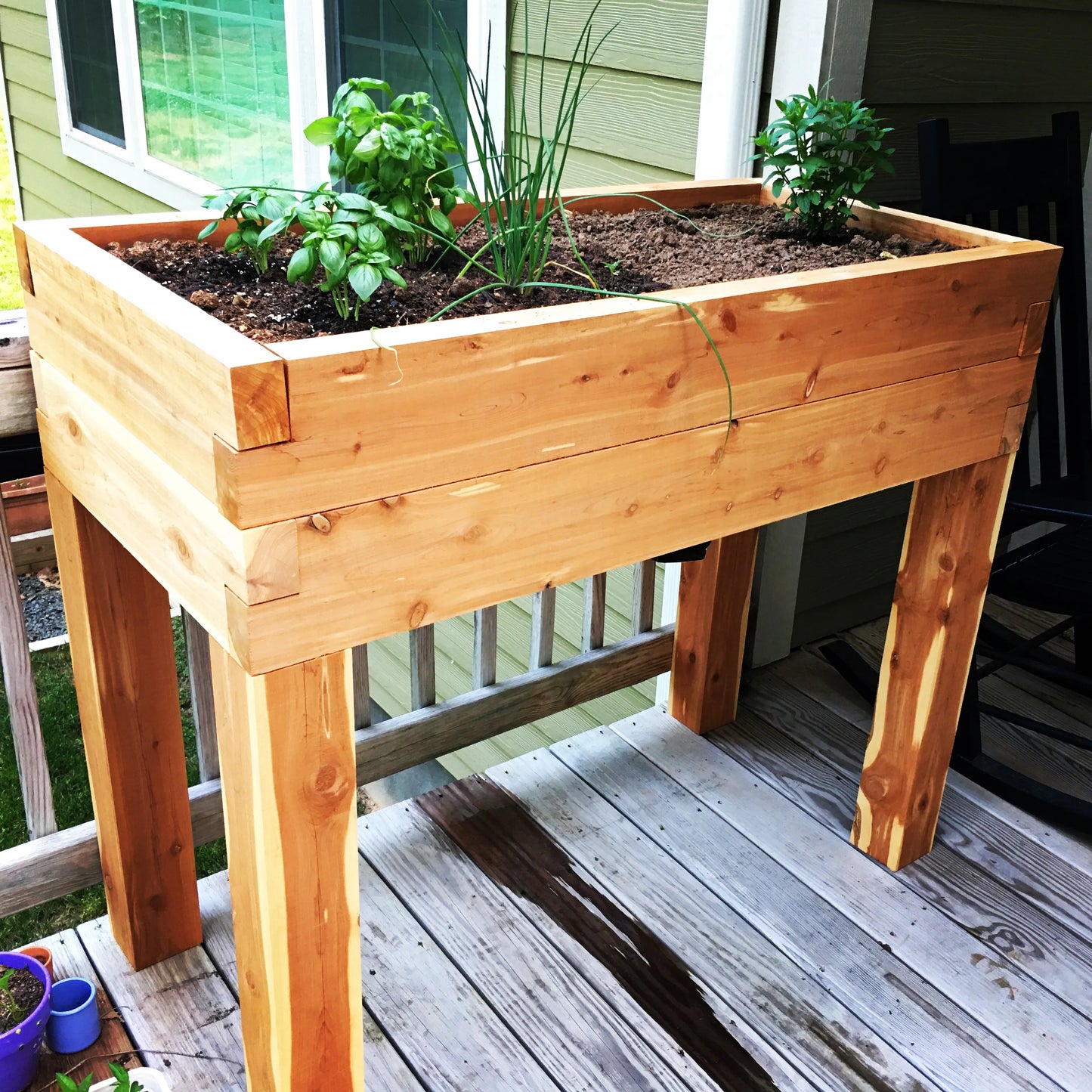 Bring your harvest to your porch or deck! Inspired by our half lap cedar garden boxes, we use the same rough cut cedar, 6" x 2" lumber, and put it onto rough cut 4" x 4" posts for legs. The bottom is enclosed and drains in the middle off the edge of a deck or patio. The box is lined with 45 mil plant and fish friendly EPDM Rubber Pond Liner to allow controlled water drainage.